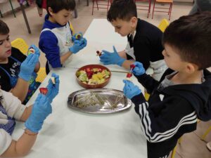 Ο κ. Τσέλιος μίλησε στα παιδιά για το επάγγελμα του σεφ, για τα οφέλη των φρούτων στον οργανισμό μας και τα καθοδήγησε στο τι πρέπει να κάνουν για να δημιουργήσουν όμορφες πιατέλες με φρούτα.Φτιάξανε μαζί σουβλάκια φρούτων και σούσι μπανάνας.Το αποτέλεσμα αισθητικά αλλά και γευστικά ήταν υπέροχο και τα παιδιά απόλαυσαν όλες τις στιγμές της δράσης.